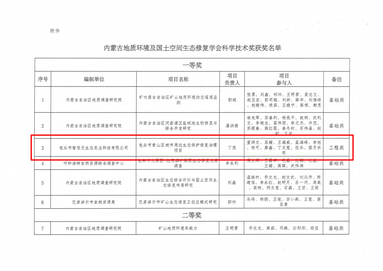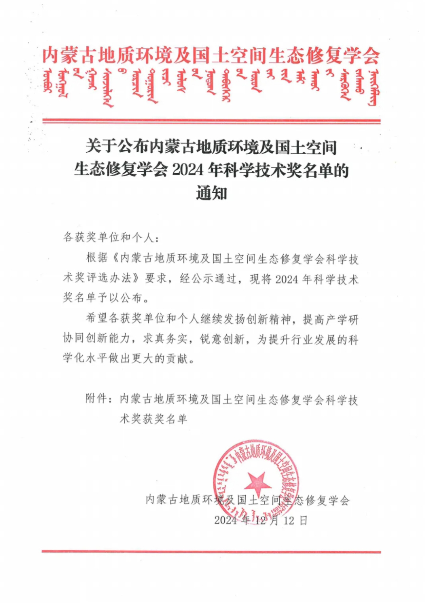 榮獲“內蒙古地質環境及國土空間生態修復學會2024年科學技術獎”一等獎